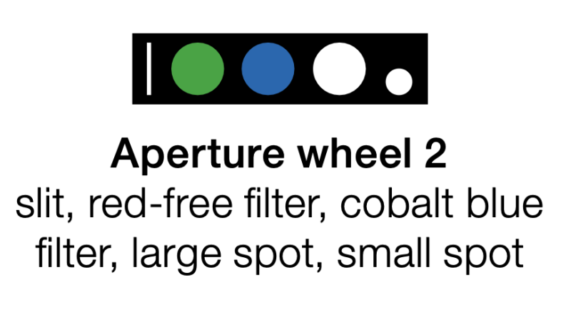 APERTURE WHEEL 2: slit, red-free filter, cobalt blue filter, large spot and small spot.
